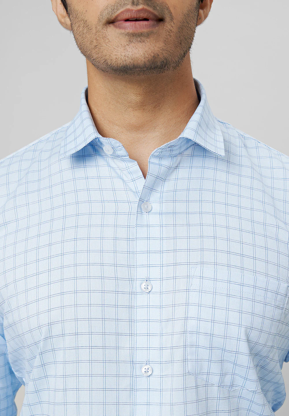 This men's blue slim fit formal shirt features a classic checks pattern crafted from micro dobby fabric for a refined texture and comfortable wear. Its tailored slim fit silhouette offers a modern, sharp look ideal for office or formal occasions, ensuring you stay stylish and confident throughout the day.