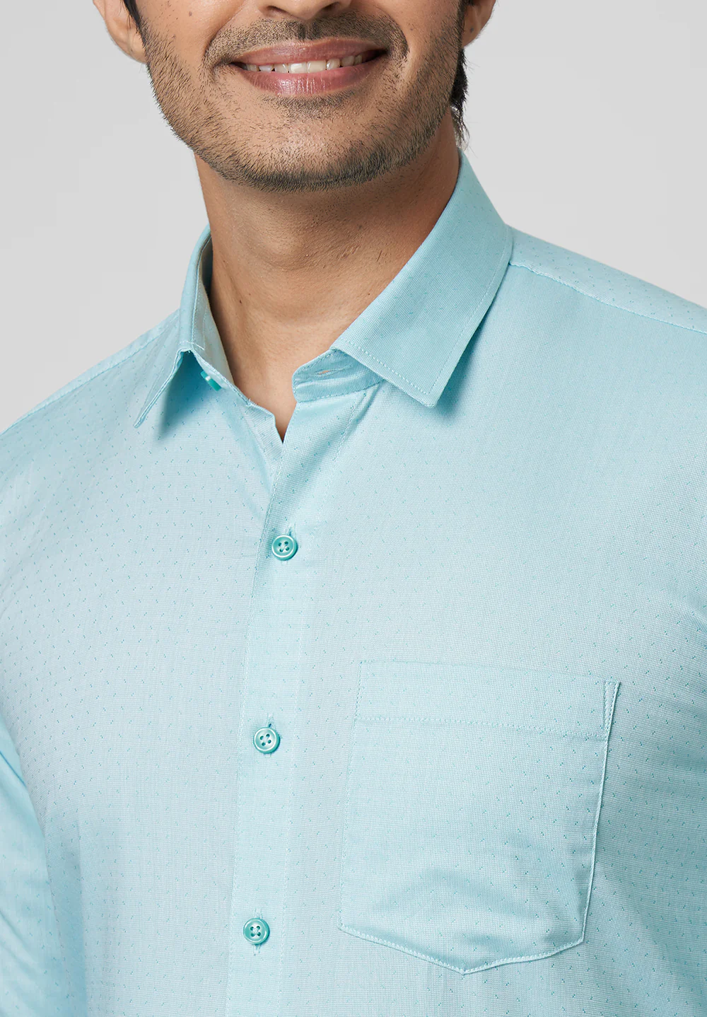 Introducing the anti-stain collection. Tailored from 100℅ breathable cotton fabric that allows you to brush off stains easily. This soft fabric designed to endure multiple washes without losing its sheen & look, ensures all-day comfort and a carefree dressing experience. This aquamarine dobby shirt has a silk-like sheen that radiates elegance. It comes in a slim fit and can be paired with the vivid-coloured solid or textured 'Cottonking Trousers' for a classy look. Ideal for office wear, & meetings