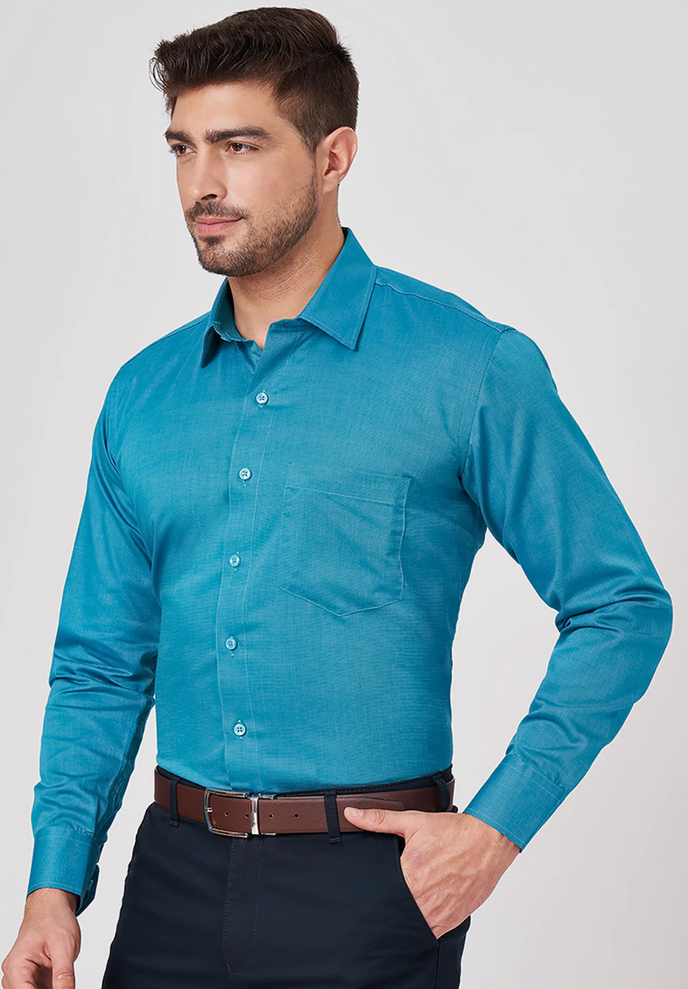 This blue micro dobby formal shirt offers a comfortable regular fit that ensures ease of movement throughout your busy day. Crafted with attention to detail, its plain design pairs effortlessly with any outfit, making it a versatile addition to your professional wardrobe. Ideal for office wear or formal occasions, this shirt combines classic style with dependable comfort.