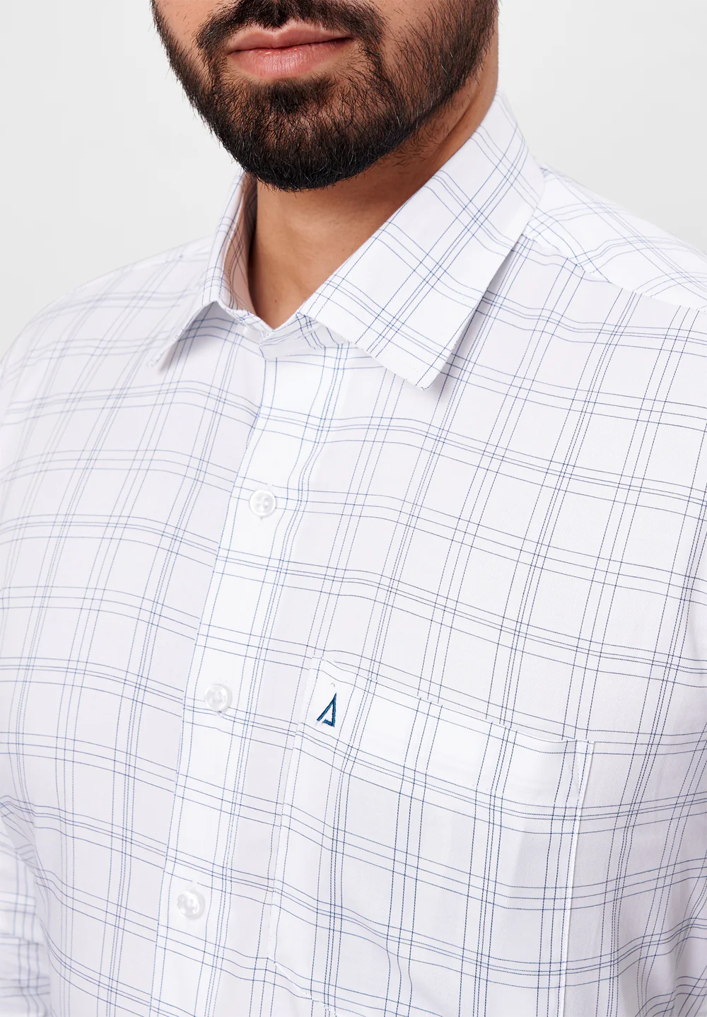 Stand out confidently with this white regular fit formal shirt featuring a bold checked pattern. Designed to make a statement, it combines sharp tailoring with a daring edge, perfect for those who challenge the ordinary. Its crisp fabric and structured fit ensure you remain comfortable and commanding, whether at a high-stakes meeting or an evening event. Embrace a fearless approach to classic style.