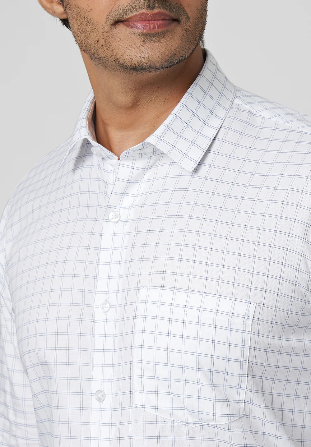 A cotton weave that has luster and is unbelievably soft on the skin. Experience the luxurious silk-like feeling in everyday clothing with 'Cottonking Micro Dobby'. This white checks shirt tailored in a slim fit is smart and has a formal appeal. It can be paired with a variety of coloured- solid, or textured trousers from 'Cottonking' for a sleek look. Ideal for office wear, & meetings.